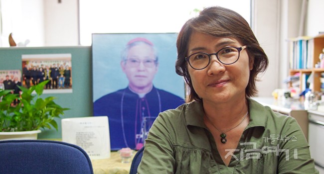 여성노동운동가 출신의 작가 박민나 씨(안젤라)가 3년째 지학순정의평화기금 사무국장으로 일하고 있다.
