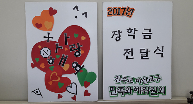 지난 8월 마산교구 민족화해위원회(민화위)는 교구 안에 사는 탈북자 자녀 33명에게 장학금 총 770만 원을 줬다. 도서 구입 지원과 함께 마산 민화위가 탈북자 자녀들을 위해 펼치고 있는 대표적 활동이다.
