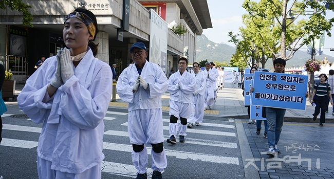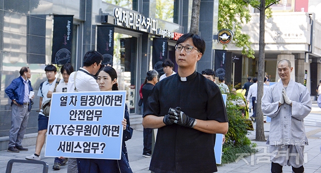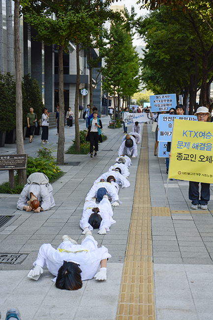 KTX 해고승무원들이 9월 20일부터 철도공사에 복직방안 논의를 요구하며 농성을 시작한 가운데, 21일 종교인들이 문제 해결을 촉구하며 광화문에서 서울역까지 오체투지를 진행했다.