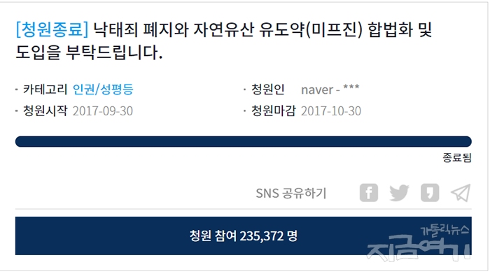 앞서 청와대 홈페이지에 “낙태죄 폐지와 자연유산 유도약(미프진) 합법화 및 도입”을 요구한 청원에 9월 30일부터 한 달 동안 23만 5372명이 참여했다. 청와대는 30일 동안 20만 명 이상이 추천한 청원에 대해서는 정부, 청와대 관계자(각 부처 장관, 대통령 수석 비서관, 특별보좌관 등)가 답하겠다고 약속하고 있다.