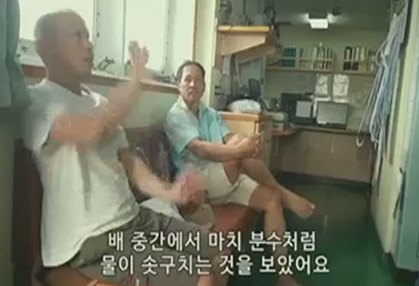 “1등 항해사는 우리 배 상태가 정말 나쁘다고 얘기했다. 배가 기울어져 있었기 때문에 우리도 배 상태가 나쁘다는 것을 알았다. 항해 중에 이상한 소리를 들었다. 그게 매우 심각했던 것 같다. 배 중간에서 물이 마구 분수처럼 솟구쳤고 배 밑 부분이 V자처럼 되었다.” (구조 직후 필리핀 선원들의 진술 내용)