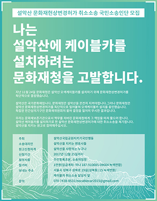 국민행동은 12월 8일 “문화재 보존기관으로서 책무를 저버린 문화재청에 책임을 따져 물으려한다”면서 “설악산 케이블카를 설치하기로 한 (문화재청의) 설악산 문화재 현상변경허가 취소소송에 함께할 국민소송인단을 모집한다”고 밝혔다.