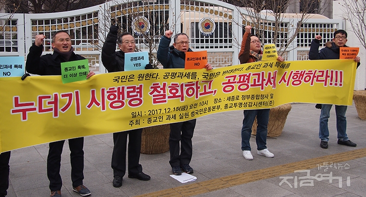 종교자유정책연구원, 개신교 단체인 평신도행동연대 등 17개 단체 대표들은 12월 15일 정부서울청사 앞에서 성명을 내 기획재정부, 국세청이 “일부 종교 세력의 기득권을 비호하는 데 급급한 나머지, 헌법과 법률에 의거한 공평과세의 원칙을 스스로 무너뜨렸다”고 말했다.