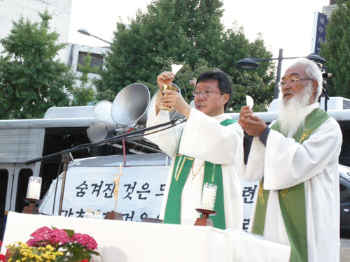 6/5 저녁 7시 용산현장에서 생명평화미사를 봉헌했습니다. 이강서 신부님(빈민사목위원회 위원장 겸 장위1동 선교본당 주임)과 문정현 신부님(전주교구)께서 공동으로 집전하셨습니다.