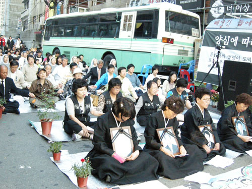 영성체 후 묵상 시간에 이강서 신부님께서 보도되지 않은 소식 하나 전하겠다고 말씀을 꺼내셨습니다. 김운회 주교님(서울대교구 사회사목담당)께서 6/4 저녁 전화로 전해주셨다고 합니다. 6/4 이명박 대통령이 7대 종단 대표들을 초청해 가진 오찬간담회에 천주교의 김희중 주교님도 참석하셔서 발언하셨다고 합니다. 김희중 주교님은 지난 5/29 국민장이 거행되던 날 용산 4구역에서 명도집행이라는 행정대집행이 있었는데 법원 집달관과 경찰의 지원으로 미사 드리던 신부님을 끌어내어 미사가 중단되고 신부님이 바깥으로 쫓겨나는 불상사가 있었는데 대단히 유감스러운 일이라고 지적했습니다. 정부가 나서서 유가족들을 위로해도 시원치 않은 판국에, 정부를 대신해서 유가족들을 위로하는 미사를 하고 있었는데, 미사를 돕지는 못할망정 중단시키다니 대단히 유감스럽다는 말씀을 하셨습니다. 가만히 듣고 있던 이명박 대통령은 "그런 일이 있었는지 전혀 몰랐다, 미안하다"며 사과했다고 합니다. 대통령이 정말 몰랐는지는 모르겠지만, 이강서 신부님은 경찰 수뇌부가 그 발언 때문에 안절부절못하고 있는 것으로 안다고 전했습니다.