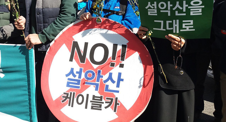 2016년 12월 28일, 설악산 오색 케이블카 설치사업은 문화재위원회 전원 부결로 사실상 무산되었습니다. 그런데 양양군이 이 사업을 다시 국민권익위원회 소속 중앙행정심판위원회에 올려 2017년 6월 중앙행심위는 케이블카 사업을 승인해 양양군의 손을 들어 주었습니다. 오색 케이블카 사업은 다시 원점으로 돌아왔고, 9월 27일 문화재위원회가 열리는 고궁박물관 앞에는 양양에서 올라온 찬성 주민 500여 명이 모였습니다. 주민들은 대부분 땅을 가진 유지들이라는 지역 주민의 증언을 기자회견에서 들었습니다. 찬성 측 주민들이 들고 있는 깃발에는 '환경 보호'와 '산양 사랑'이 적혀 있었습니다. 환경을 보호하는데, 어떻게 멸종위기종 1급 산양의 서식지를 파괴하는 설악산 오색 케이블카 사업을 찬성할 수 있는지 이해할 수 없습니다. 양양군 공무원들과 지역유지들, 주민들이 동원된 찬성 집회 앞에서 불과 30명 남짓한 환경활동가들은 설악산을, 산양을 살려 달라는 피켓을 들고 서 있었습니다.
