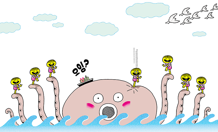 계단을 뛰어 내려가며 집 밖으로 나서는 순간 나와 ‘나들’ 사이에서는 큰 변화가 생긴다. 본래의 나와 여섯 명의 ‘나들’은 구분되어 그려져 있었다. 나는 눈을 동그랗게 뜨고 있는데 반해 ‘나들’은 눈동자가 그려지지 않고 그저 선으로만 표현되었다. 집 안에서는 항상 내가 앞장을 서고 여섯 명의 ‘나들’이 내 뒤를 따랐지만 먼저 밖으로 나서는 건 ‘나들’이고 나는 맨 끝에서 따라간다. ‘나들’의 상상과 힘이 나를 이끌게끔 역전되었다.