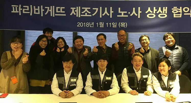 파리바게뜨 본사(파리크라상)와 파리바게뜨 가맹점주협의회, 민주노총 전국화학섬유식품산업 노동조합, 한국노총 중부지역 공공산업 노동조합, 시민사회대책위 등 사측, 노조, 정당, 시민단체 대표들은 1월 11일 ‘파리바게뜨 제조기사 노사 상생 협약’에 합의했다.