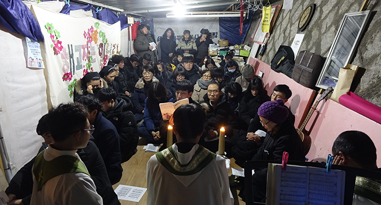 1월 29일 저녁 아사히글라스 공장 정문 앞 천막농성장에서 봉헌된 미사에는 대구, 왜관, 구미 지역에서 온 수도자, 신학생, 신자 등 40여 명이 참석했다.
