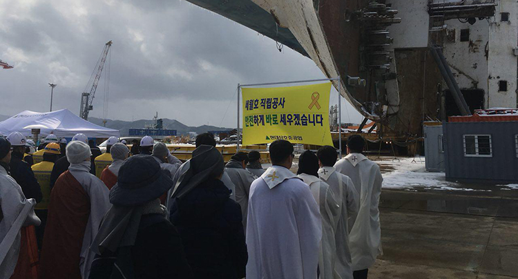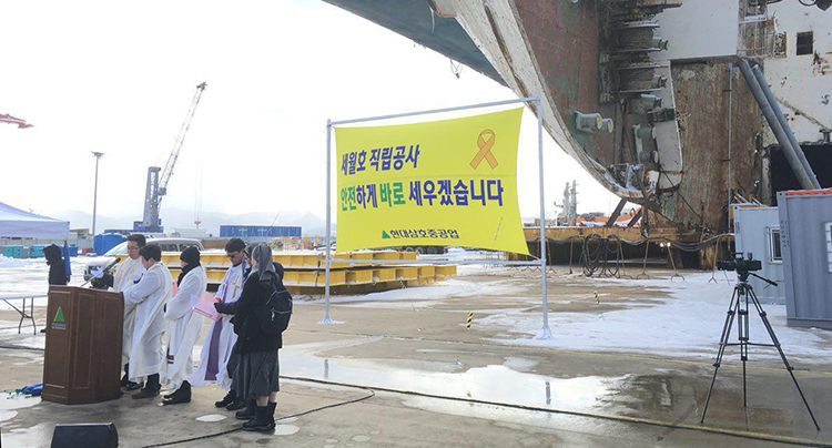 2월 6일 오후 3시 목포신항에서 열린 ‘세월호 직립 공사 위령제’에는 천주교, 불교, 원불교, 개신교에서 100여 명이 참석했다.