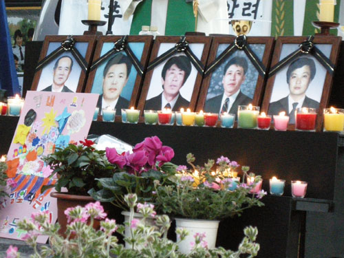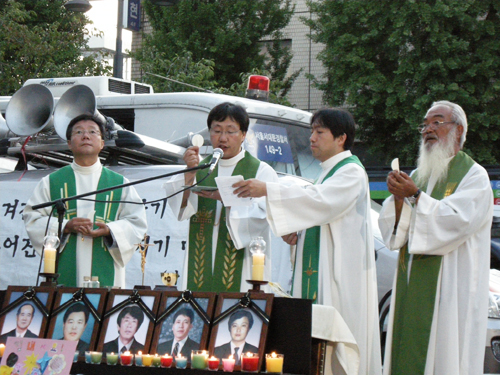 6/12 저녁 7시 용산현장에서 생명평화미사를 봉헌했습니다. 이강서 신부님(빈민사목위원회 위원장 겸 장위1동 선교본당 주임), 최형규 신부님(교정사목위원회), 이광휘 신부님(금호1가동 선교본당 주임), 문정현 신부님(전주교구)께서 공동으로 집전하셨습니다.