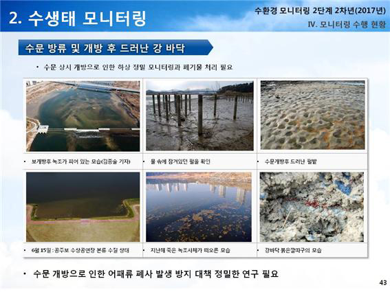 이에 따라 “상시적 보 개방 모니터링, 4대강 사업 정책 감사, 통합 물관리”등을 약속하고 지난해 6월부터 전체 16개 보 가운데 10 보를 시범 개방했다. 그리고 시범 개방 결과에 따라 3월 22일 이낙연 국무총리는 ‘세계 물의 날’ 기념식에서 올해 안에 16개 보 전체를 개방하겠다고 밝혔다.