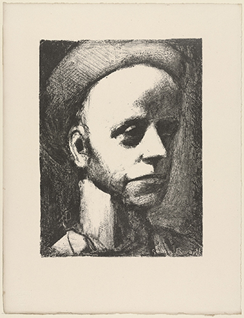 그가 그렸던 “나보다 가치 있는 가난하고 소외된 사람들” 중 대표적 인물들이 ‘광대’였습니다.(그림3) 그가 “밤의 절규, 낙오자의 오열, 목멘 웃음”을 본 이웃들이었습니다. 루오의 자화상을 보면 그가 자신을 어디에 위치시켰는지 알 수 있습니다.(그림2) 그의 대다수 자화상은 자신이 그린 광대의 초상들과 유사합니다. 광대 의상의 일부로 표현된 하얗고 동그란 모자와 이마의 표현뿐만이 아니라, 작가가 생전에 자신을 이 이웃들과 동일시했던 자전적 기록들을 통해 확인할 수 있습니다. 그림의 제목에서 알 수 있듯이, 광대는 당시 탐욕과 교만으로 쓰는 가면의 이면에 있는 인간의 진정한 얼굴, 동시에, 이러한 세상에서 살아남기 위해 모두의 핍박과 웃음거리가 되는 가면을 써야 하는 이들의 역설을 보여 주는 존재로 그려졌습니다.