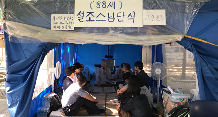 “스님이 너무 힘드시니 한 2-3분 정도 짧게 인사만 드리고 나오는 게 좋겠습니다.” 지난주 조계종 적폐청산과 개혁을 위해 장기간 단식을 하고 있는 설조 스님을 개신교, 불교, 천주교 인사들이 연대 방문했을 때 불교 측에서 나온 제안이다. 왜 아니 그러하겠는가. 88살이면 몸뚱이 하나 건사하기도 힘든 나이인데 그토록 오래 단식을 해 오고 있으니 스님의 건강을 걱정하지 않을 수 없는 터였다. 이제 단식 35일을 지나 이 글을 쓰는 지금까지도 단식을 계속하고 있으니, 그야말로 ‘목숨을 건 필사의 단식’이다. 무엇이 스님을 이렇게 목숨을 걸지 않으면 안 되는 상황으로 내몰고 있는 것인가. 7월 18일 ‘3.1 100주년 종교개혁연대’ 대표자들이 설조 스님을 방문한 바로 그날 불교계 시민단체는 <한겨레>에 ‘조계종 개혁’, ‘파계 의혹 있는 권승 퇴진’, ‘설조 스님 단식 중단과 이후 종단개혁 도모’ 등을 내용으로 하는 큼지막한 광고문을 실었다. 그러나 그러한 걱정은 스님에게는 번잡스럽고 지나친 기우였을까. 모든 것을 태워 버릴 듯 이글거리는 태양 아래 노출된 천막 안으로 들어갔을 때 방문객들은 노스님의 풍채와 표정, 작지만 흐트러짐 없는 목소리에 내심 놀라는 눈치였다.