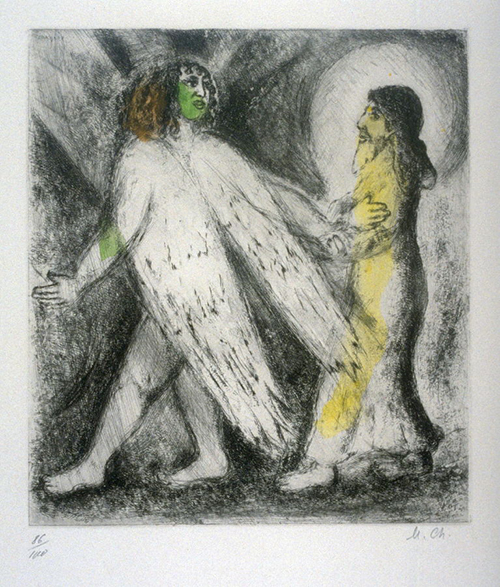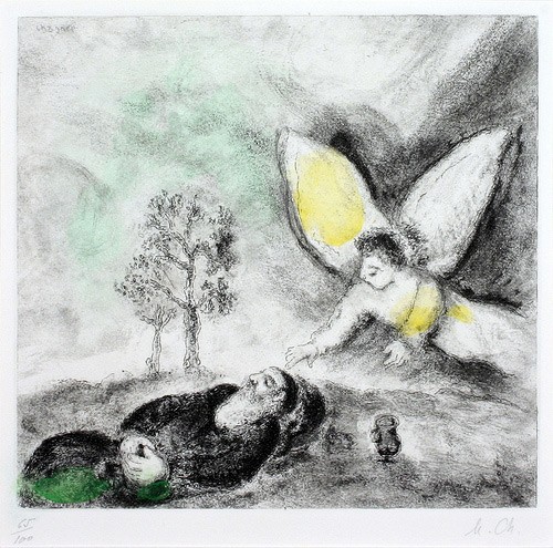 그림 속 누워서 자고 있는 할아버지는 엘리야입니다. 솔로몬 이후 이스라엘 전 계층에 걸쳐 일상이 된 우상숭배가 가장 극심했던 아합 왕 시대, 모든 백성들 앞에서 하느님의 제단을 다시 고쳐 쌓고 바알 예언자들과 1:1000 정도로 맞붙어 하느님만이 주님이심을 증명하고 그들을 전멸시킨 위업을 달성한 뒤 왕비 이제벨의 살해 협박에 두려움에 가득 차 도망쳤던 이 대예언자는 브에르 세바에 이르러 뻗어 버립니다. 그러고는 “저는 저희 조상들과 하나도 다를 것이 없는 인간입니다. 주님, 이제 충분하니 절 죽여 주십시오.” 하고 잠이 듭니다. 이런 엘리야를 천사가 깨웁니다. 샤갈은 천사가 아주 조심스럽고 섬세한 손길로 엘리야를 깨우는 순간을 담음으로써 하느님께서 우리를 존중하고 아끼시는 방식을 표현하고자 했습니다. 그리고 색의 절제를 통해 하느님께서 주시는 새 힘을 천사의 몸에 가득한 노란 색으로, 엘리야에게 새롭게 차오르는 힘을 녹색으로 표현합니다. 둘 다 새 힘을 의미하지만 ‘몸’에 새 힘을 얻어야 하는 땅의 존재, 인간의 조건을 표현한 구분이기도 합니다. 머리맡에는 물과 빵이 놓여 있습니다. 이것을 먹고 자고, 또 일어나 먹고 잔 엘리야는 새 힘을 얻어 사십 일을 달려 하느님의 산 호렙에 이릅니다. 그리고 여기에서 자신이 어느새 규정하게 된 막강한 권능의 하느님이 아니라 새로운 하느님을 만납니다. ‘부드럽고 조용한’ 소리로 말씀하시는 하느님을. 그리고 본래의 자리로 새로운 파견을 받습니다.