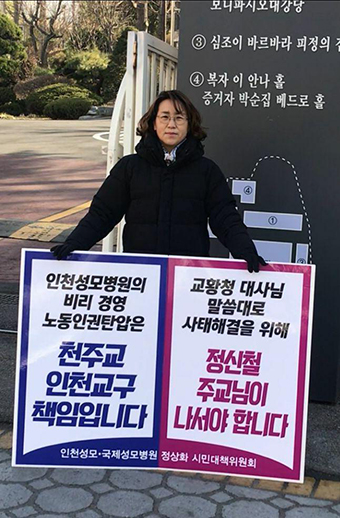 인천성모병원 사태 해결과 노동조합 활동 정상화를 위해 인천교구장 정신철 주교가 직접 나설 것을 촉구하는 1인 시위가 13일부터 인천교구청 앞에서 진행되고 있다.