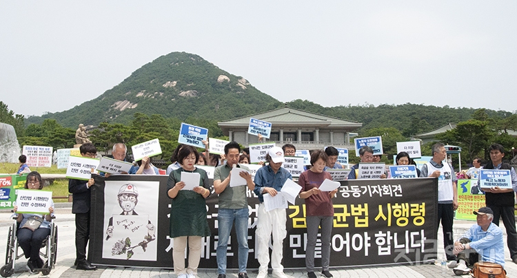 이들은 14일 청와대 앞에서 기자회견을 열고, “도급승인 대상 확대”, “원청책임 강화”, “보호범위 확대”, “작업중지해제 절차 강화” 등으로 하위법령안을 개정하라고 요구했다.