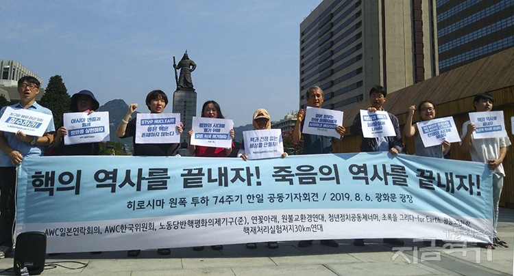 먼저 이날 탈핵과 평화운동 관련 사회단체들은 서울 광화문광장과 히로시마 평화공원에서 한일 공동 기자회견을 열고, “세계의 모든 핵 폐기”, “모든 핵발전 즉각 중단”, “핵발전 신설과 수출 저지”와 “아시아 전쟁 피해자에 대한 일본의 사죄와 보상”, “지구상 미군기지 철수”도 요구했다.