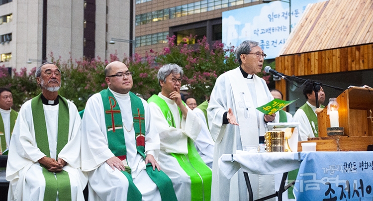 12일 광화문광장에서 사제, 수도자, 신자 150여 명이 참여한 가운데 천주교 정의구현전국사제단이 봉헌한 이 미사는 지난 7월 15일 시작된 ‘한반도 평화정착 기원 월요미사’이기도 하다.