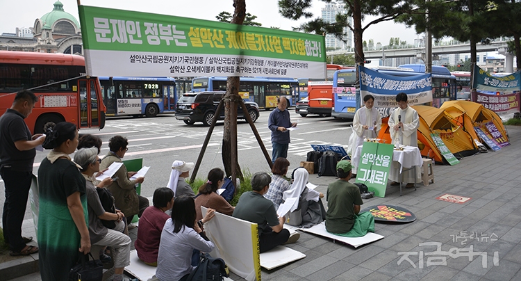설악산국립공원지키기국민행동(이하 설악산지키기국민행동) 등은 21일로 설악산 케이블카 사업 백지화를 요구하며 환경부 서울사무소가 있는 서울스퀘어 앞에서 15일째 농성하고 있다.