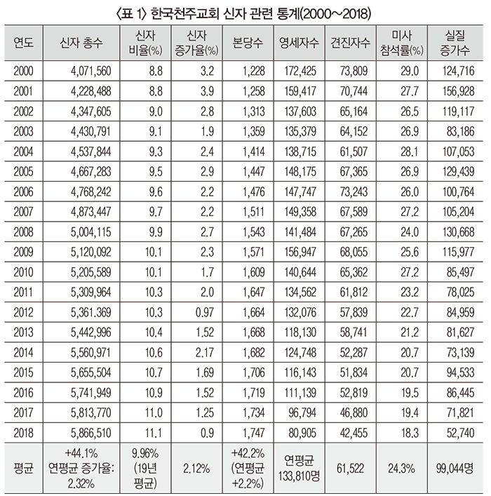 <표 1>에서 보듯이 2000년 이후 ‘신자 총수’와 ‘신자 비율’은 꾸준히 증가해 왔다. 더구나 정부 주도 통계조사인 ‘2005년 인구주택총조사’(이하 인구총조사)에서 천주교 신자 수가 교회통계보다 50여만 명이나 많은 것으로 확인되어, 머지않아 불교를 추월하리라는 기대가 많았다. 하지만 2017년 1월 발표된 ‘2015년 인구총조사’ 결과는 천주교가 자체 집계한 교회통계보다 신자 수가 3분의 1이나 감소한 것으로 나타나면서 큰 충격을 던져주기도 했다. 정부 통계와 관계없이 교적 자료를 바탕으로 매년 발간하는 ‘한국천주교회 통계’에 따르면, ‘신자 총수’는 연평균 2.3퍼센트씩 증가했다. 2000년 당시 400만 명을 웃돌던 신자 총수는 지난해 586만여 명으로 늘어나 18년간 44.1퍼센트의 증가세를 보이면서, ‘신자 비율’은 8.8퍼센트에서 11.1퍼센트로 늘어났다. 이런 증가 추이라면 3년 안에 600만 명을 넘어설 것으로 보인다. 본당 수도 비슷한 추이로 늘어났는데, 2000년 1228개에서 2018년 1747개로 신자 총수의 증가에 비례해 증가했다고 확인된다.