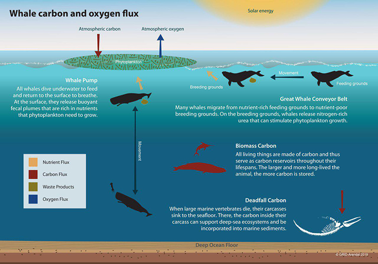 또 고래가 배출하는 배설물도 이산화탄소 흡수에 기여한다. 심해에서 먹이를 찾는 고래는 해수면 근처에서 배설물을 내보내는데 이때 질소와 인, 철을 포함한 다량의 영양분이 함께 배출된다. 이 영양분들은 식물성 플랑크톤의 성장을 자극하고, 플랑크톤의 광합성으로 이산화탄소가 흡수된다. 남극해 향유고래 1만 2000마리의 배변활동은 식물성 플랑크톤 생장을 자극해 매년 대기 중에 20만 톤의 탄소를 바다에 격리시키고 있다. 고래가 이렇게 인류에게 제공하는 생태계 서비스를 돈으로 환산하면 마리당 200만 달러(약 24억 원) 수준이다.