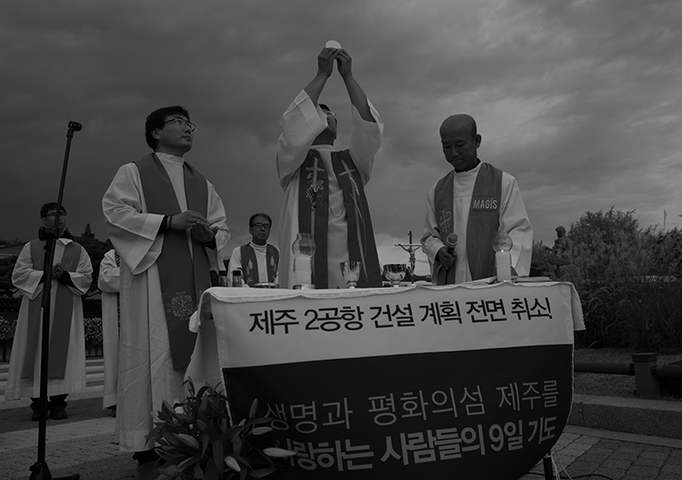 이에 따라 제주2공항 건설을 반대하는 9일기도가 11월 3일부터 청와대 분수대 광장 앞에서 진행되고 있습니다. 이날 미사에서 강론을 맡은 천주교 제주교구 생태환경위원장인 허찬란 신부는 복음 말씀의 자캐오를 인용하면서 “문재인 대통령은 함께 촛불을 들고 고통을 겪었던 이들의 마음을 공감해 달라”며 “목숨을 걸고 단식이라는 최후의 수단을 쓸 수밖에 없는 이들의 심정을 헤아려 이곳으로 내려와 달라”고 호소했습니다.