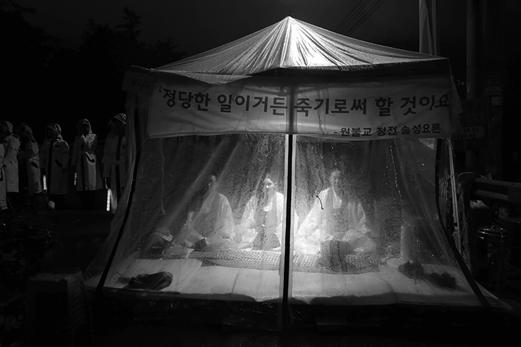 오늘은 성주 소성리 진밭교당 1000일차가 되는 날입니다. 원불교 정전 솔성요론을 인용하여 “정당한 일이거든 죽기로써 할 것이요”라는 현수막을 걸고 매일 24시간 기도를 바쳤습니다. 진리와 도에 어긋남이 없고 양심에 부끄러움이 없으며 남에게 손해가 없는 일은 밖으로 어떠한 난관에 부딪히고 안으로 아무리 하기 싫은 마음이 날지라도 죽기로써 하자는 것이니 원불교 교무뿐만 아니라 소성리 주민들의 결연한 의지가 담겨 있습니다.