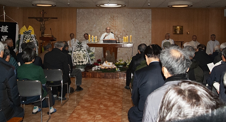 이날 미사 강론에서 두봉 주교는 “우리는 살다 모두 그 나라로 돌아갈 사람이다. 주님이 부르시면 가는 것은 당연한 순리”라며 “주님을 모시고 세상을 떠나면 영원히 주님과 함께 살게 된다. 주님 말씀대로 하느님과 이웃에 대한 사랑과 봉사를 실천하고 살다 주님 곁으로 가는 것”이라고 말했다.