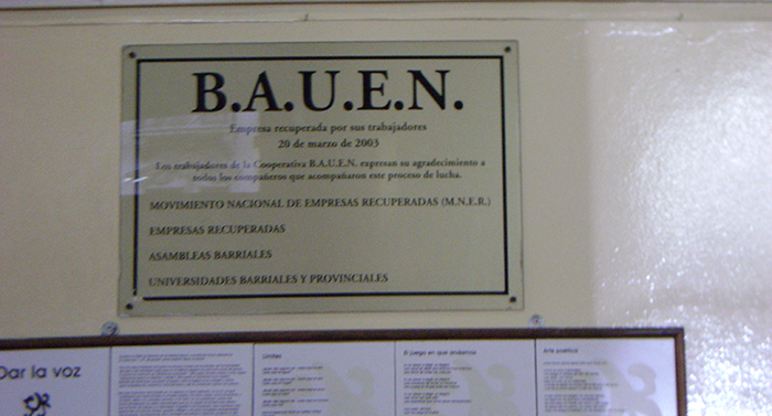 바우엔 호텔은 2001년 12월에 파산해 문을 닫았다. 당연히 갚지 못한 빚은 많았다. 우리 상식으로는 거기 노동자들은 그냥 실업자가 되어 다른 직장을 알아보든지 했을 것이다. 그러나 이들은 그러지 않았다. 정부의 실업보험금을 받으면서 호텔을 점거하며 국가의 지원을 요구하였다. 2003년 3월부터 직원 약 120명이 스스로 자율적 조합을 만들었다. 이 당시 대통령은 페론주의 좌파인 네스토르 키치네르였다. 정부는 조합을 법률적, 재정적으로 지원했다. 국유화한 것이다. 그러나 운영은 이들 노동자 조합이 맡는 방식이다. 즉 노동자들의 소유가 아닌 것이다.