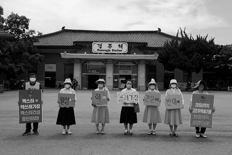 경주와 연대의 피켓팅을 마치고, 감포 바다를 향했습니다. 감포 바다에서는 신비로운 문무대왕릉을 바라보며, 이 아름다운 곳에 월성 핵발전소와 핵쓰레기장이 있다는 비현실의 현실이 역설적이었습니다. 핵발전소가 있는 나아리 해변에는 낚시를 하는 사람이 많았습니다. 원자력안전법에 의해 사람들이 출입도 거주도 할 수 없는 지역을 표시한 초록색 펜스 안으로는 솔밭으로 이루어진 공원도 있었습니다. 주말이 되면 그 솔밭으로 사람들이 텐트를 설치하고 숙박을 합니다. 뿐만 아니라 그 펜스 안에는 월성 핵발전소 홍보관도 있었습니다. 월성 핵발전소 홍보관 앞에는 나아리 주민들이 집단이주를 요구하며 농성을 하고 있는 농성장도 있었습니다. 농성장은 ‘2021일’을 맞고 있었습니다. 충격적인 일이었습니다.