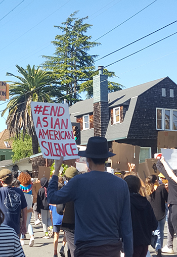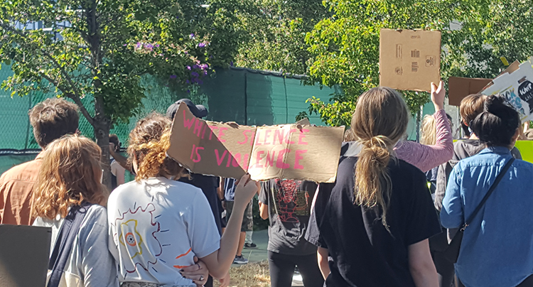 조금 망설였던 제 걱정들이 무색하게 모임 장소에는 다양한 피부 색깔을 가진 사람들, 잠든 아기를 유모차에 태워 나온 부부, 아빠 목말을 타고 “정의가 없다면 평화도 없다!”고 외치는 어린이들, 주인이 적어 준 구호를 등에 붙이고 함께 걷고 있는 온갖 종류의 강아지들까지. 남녀노소, 인종의 다양함을 넘어 하느님이 지어 주신 모든 피조물이 함께 걷고 있다는 느낌이었습니다. 집 앞에 물과 간식을 두고 행진하는 사람들에게 나눠 주는 사람들, 자신이 가지고 있는 악기를 들고 나와 연주하며 자신의 마음을 전하는 사람들, 모든 사람이 소중해 보였습니다. 이 와중에 우리는 마스크를 쓰고 서로의 사회적 거리를 신경 써야 함이 조금 속상하기도 했습니다.