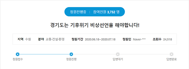 지난 6월 18일 기후위기 경기비상행동은 “경기도 기후위기 비상선언”, “2050 온실가스 배출제로 계획수립”, “기후조례 제정”, “범도민 추진기구 구성”을 경기도에 촉구하며 도민청원을 시작했다.