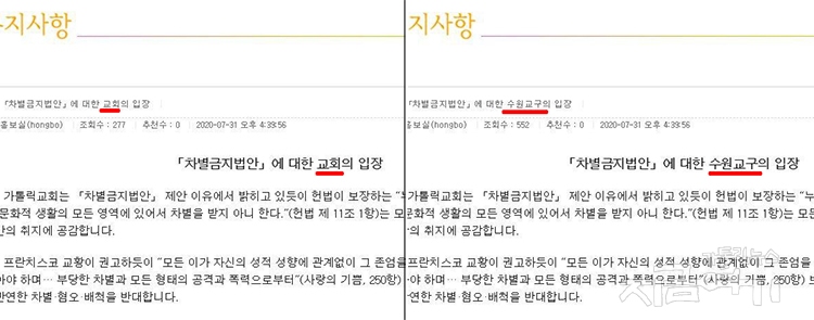 또 기사에는 이 법이 “어떤 차별도 발생하면 안 되기 때문에 제도적 장치로서 필요하며, 일부 사회 집단이 일방적으로 안 된다고 외치는 주장을 식별하도록 교회 차원에서 명확하게 차별금지에 대한 내용을 신자들에게 제시해야 한다”는 인천교구 정의평화위원회 위원장 양성일 신부의 발언도 담겼다.