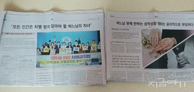 먼저 <가톨릭신문>은 7월 12일자 1면과 11면에서 “가톨릭교회 시각에서 바라본 차별금지법”을 다루면서, 포괄적 차별금지법이 왜 필요한지 소개하고, 차별금지에 관한 교회 문헌, 주교회의 정의평화위원회 성명, “마땅히 제정되어야 하는 법”이라는 천주교인권위원회의 입장 등을 실었다.