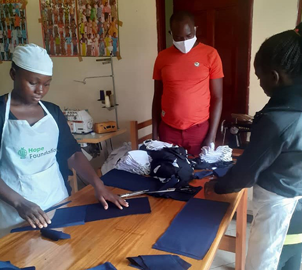 우간다에서는 기존에 운영 중이던 “여아교육을 위한 다목적센터” 내 여성 45명의 마스크, 손세정제, 생리대, 액상비누 생산을 지원하였습니다. 본 센터는 작년에 한국희망재단이 우간다 여아들의 조혼과 학교 중퇴를 예방하기 위해 설립한 것입니다. 다음은 마스크 제작에 직접 참여한 한 여성의 말입니다.