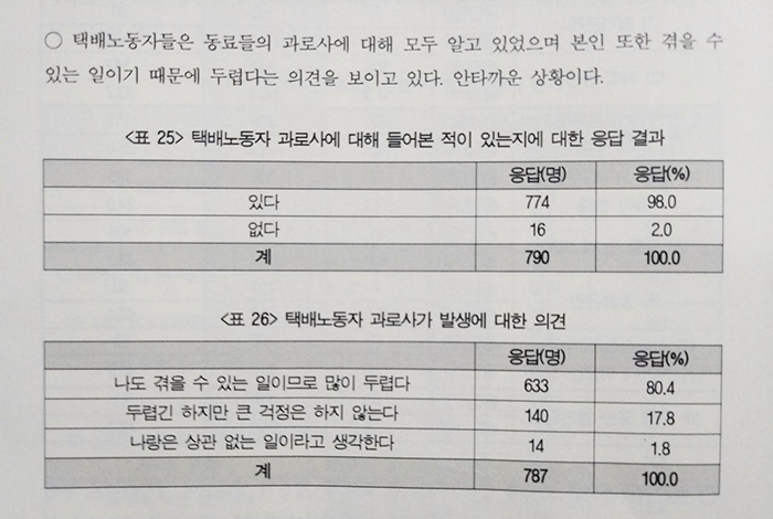 또 응답자의 98퍼센트가 택배 노동자의 과로사에 대해 들어본 적이 있고, 80퍼센트가 나도 겪을 수 있는 일이라 많이 두렵다고 답했다.