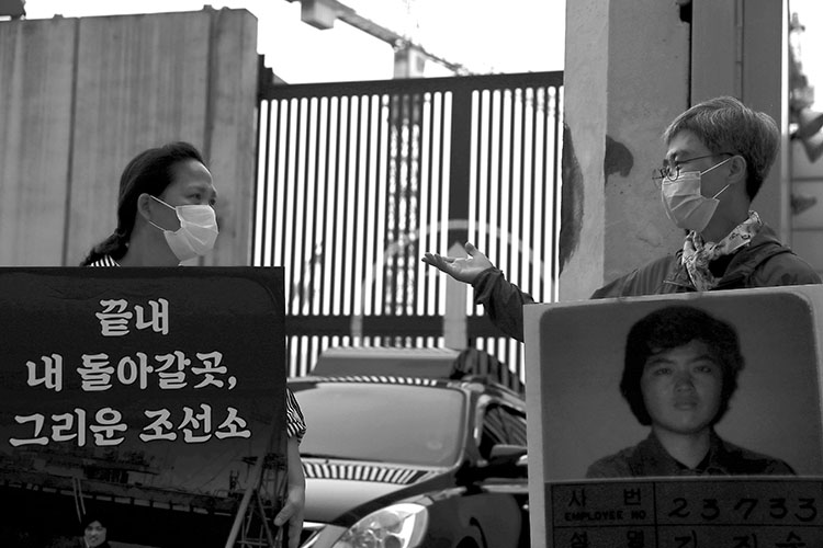어머니는 그 마음으로 김진숙 지도위원이 복직 투쟁 선전전을 하고 있는 한진중공업 영도조선소를 찾았습니다. 김진숙 지도위원이 35년 동안이나 해고자로 복직되지 못하는 것 그 자체가 중대 재해라고 생각하기 때문입니다. 어머니는 김진숙 지도위원의 손을 꼭 잡고, “만나 뵙고 싶었다”라고 말합니다. 항암 투병 중인 몸으로 “죽기 전에 이것을 하지 않으면 안 된다”라는 김진숙 지도위원의 말이 크게 와닿았다고 합니다. 어머니는 “김진숙 지도위원이 꿈속에서도 원하는 복직이 꼭 이루어지길 빈다”라며 꼭 껴안았습니다. 아들을 잃은 엄마의 마음으로.
