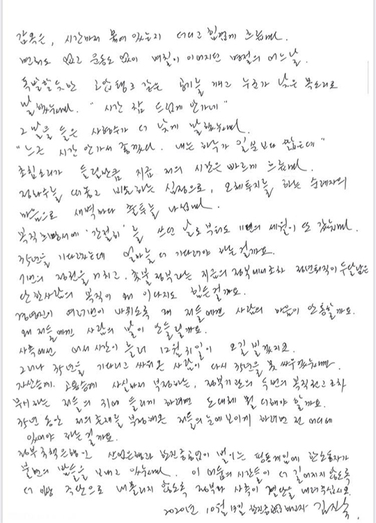 김진숙 지도위원도 자필로 쓴 발언을 통해 “35년을 기다렸는데 얼마를 더 기다려야 하는 걸까요. 일곱 번의 정권을 거치고, 촛불 정부라는 지금의 정부에서조차 정년퇴직이 두 달 남은 단 한 사람의 복직이 왜 이다지도 힘든 걸까요. 경영진이 여러 번이 바뀌도록 왜 저들에겐 사람의 마음이 안 통할까요. 왜 저들에겐 사람의 말이 안 들릴까요”라며 “자산승계, 고용승계 사실마저 부정하는, 정부기관의 두 번의 복직 권고조차 무시하는 저들의 귀에 들리게 하려면 도대체 뭘 더 해야 할까요. 35년 동안 저의 존재를 부정해 온 저들의 눈에 보이게 하려면 전 어디에 있어야 하는 걸까요. 정부 국책은행인 산업은행과 한진중공업이 벌이는 핑퐁게임에 한 노동자가 불면의 밤들을 보내고 있습니다”라고 호소하고 있습니다.