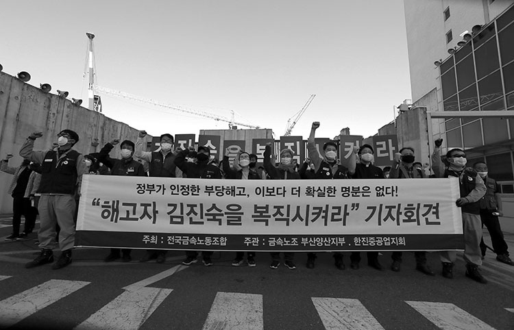 10월 13일 오전 10시, 한진중공업 영도조선소 앞에서 “해고자 김진숙을 복직시켜라”라는 기자회견이 열렸습니다. 민주화보상심의위원회는 2009년에 이어 2020년에도 김진숙 지도위원의 복직을 권고하는 결정을 내렸지만, 주채권은행인 산업은행은 한진중공업이 해결할 일이라고 합니다. 한진중공업은 명분이 없다며 교섭조차 거부하고 있습니다. 한진중공업과 산업은행이 김진숙 지도위원의 복직 문제에 대한 책임을 핑퐁식으로 서로 떠넘기는 동안 한 노동자는 불면의 밤들을 보내고 있습니다.