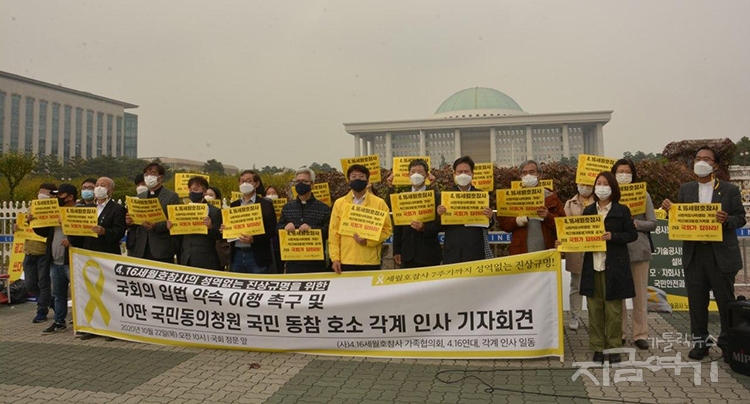 22일 4.16세월호 참사 가족협의회와 4월16일의약속국민연대(4.16연대) 그리고 종교, 시민사회 등 각계 인사들이 기자회견을 열어, 세월호 참사의 진상규명을 위해 국회의 입법 약속 이행을 촉구하고, 10만 국민동의청원에 동참을 부탁했다.