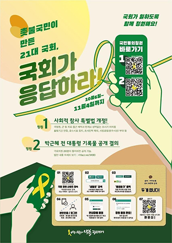 10월 6일부터 ‘사회적 참사 특별법 개정’과 ‘박근혜 전 대통령 기록물 공개 결의’에 관한 청원이 진행 중이다. 11월 5일까지 10만 명이 동의해야 한다. 22일 현재 사회적 참사 특별법 개정 청원은 3만 5000여 명이, 전 대통령 기록물 공개 청원은 3만 2000여 명이 참여했다.