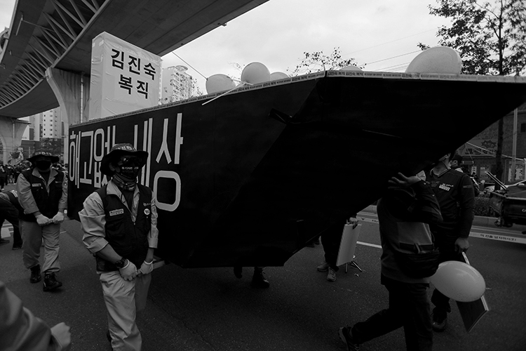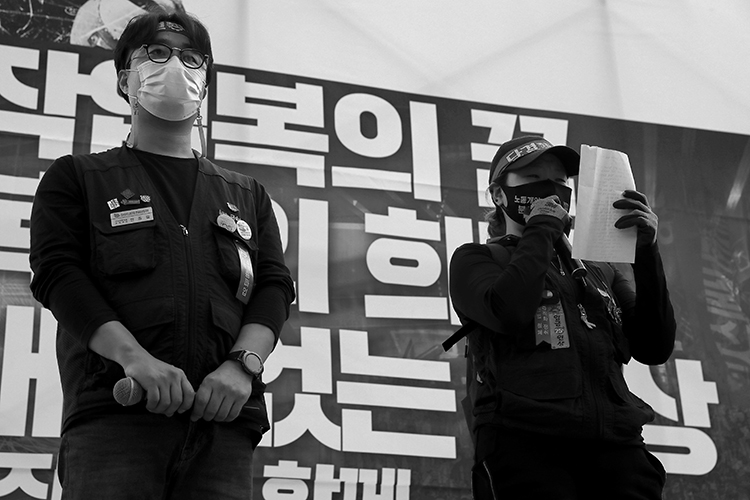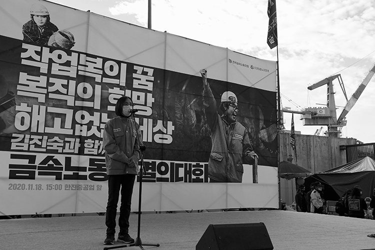 김진숙 지도위원은 현대중공업 서진 하청노동자인 변주현 동지에게 보내는 “주현씨, 안녕~”으로 시작하는 발언을 정혜금 사무국장이 대신해서 낭독했습니다. 김진숙 지도위원은 26세에 허울뿐이었지만 조선소 용접공 정규직이 되었으나, 35년의 세월을 건너 주현 씨는 27세에 싼값에 쓰다가 가책 없이 버려지는 비정규직 조선소 용접공이 된 사실을 술회하며 “그래서 미안해. 한스럽고”라고 말합니다. 김진숙 지도위원은 “민주노조를 함께 꿈꿨던 동지가 국가권력에 살해되고, 크레인에서 죽어 내려오는 나라에선 살아 있는 게 오히려 미안하고 내내 부끄러운 일이었다”라며 “그러나 주현 씨, 주현 씨는 그렇게 살지 마”라고 말합니다. “투쟁도 좋지만 맛있는 거 많이 먹고, 따뜻한 데서 자고, 영화도 보고, 좋은 음악도 들으면서 살아. 좋은 사람 만나서 사랑도 하고. 아파서 중요한 투쟁 앞에 할 일을 못하는 건 너무 안타까운 일이다. 주현 씨는 건강하게 싸워라. 서진 투쟁에 함께 연대하지 못해서 미안해. 같은 꿈을 꾸는 동지야, 꼭 복직하길 바래”라고 말합니다. 마치 자신이 하지 못했던 일들을 유언처럼 말하고 있었습니다.