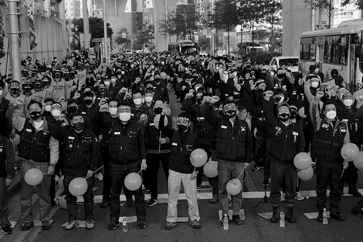 11월 18일 오후 한진중공업 영도조선소 앞. 끝이 보이지 않을 정도로 금속노동자들이 전국에서 달려왔습니다. 김진숙 지도위원의 복직을 위한 금속노동자 결의대회가 있었기 때문입니다.