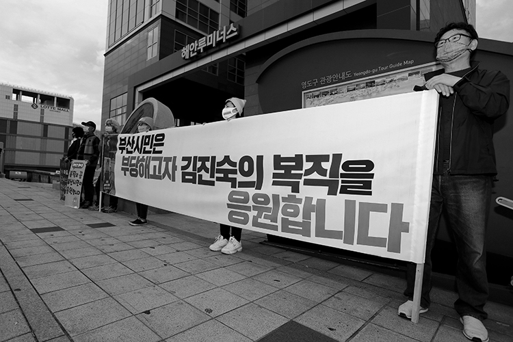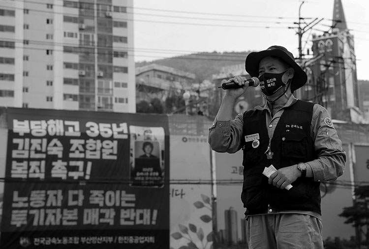 금속노조 한진지회 심진호 지회장은 부산 영도까지 달려온 금속노조 동지들과 조선업종노조연대 동지들 그리고 민주노총 동지들에게 감사의 인사를 전하며 “2011년 치열했던 한진중공업 정리해고 투쟁이 끝나고 김진숙 동지를 한동안 잊고 살았다”라며 “저는 모든 노동조합 활동을 접고 피해만 다녔습니다. 금속노조 선거철을 피하기 위해 필리핀까지 도망가다시피 지원해서 파견을 갔었습니다”라고 술회했습니다. 심진호 지회장은 김진숙 지도위원의 암이 재발했다는 소식을 듣고 “이제는 우리가 김진숙 동지만을 위해 함께 싸워야 합니다. 동지들과 함께하는 복직투쟁, 행동하고 실천하는 복직투쟁을 만들어 가겠습니다”라며 “반드시 김진숙 동지, 우리 김진숙 조합원의 복직에 대한 한을 풀고, 쫓겨 나왔던 한진중공업 정문을 당당히 드나들 수 있도록 만들어 내겠습니다”라고 김진숙 지도위원의 복직에 대한 강한 결의를 다졌습니다.