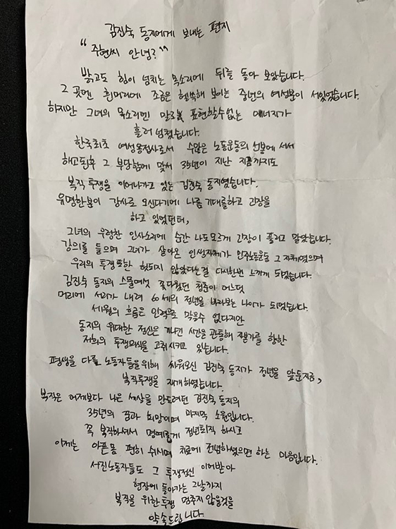 김진숙 지도위원의 발언에 이어 현대중공업 서진 하청노동자인 변주현 씨가 ‘김진숙 동지에게 보내는 편지’를 낭독했습니다. 그 편지는 김진숙 지도위원의 발언처럼 “주현씨, 안녕?”으로 시작합니다. 변주현 씨는 “김진숙 동지의 스물여섯 꽃다웠던 청춘이 어느덧 머리에 서리가 내려 60세의 정년을 바라보는 나이가 되었습니다.... 세월의 흐름은 인력으로 막을 수 없다지만, 동지의 위대한 정신은 기나긴 시간을 관통해 자본가를 향한 저희의 투쟁의식을 고취시키고 있습니다”라고 말합니다. 변주현 씨는 김진숙 지도위원에게 “이제는 아픈 몸 편히 쉬시며 치료에 전념하셨으면 하는 마음입니다”라며 평생을 다른 노동자들을 위해 싸워 온 김진숙 지도위원에게 눈물의 편지를 보냈습니다.