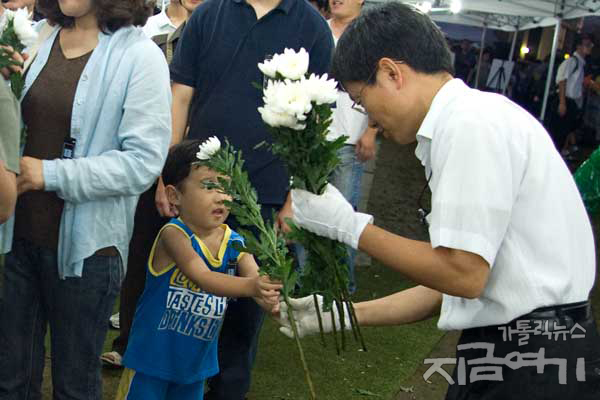 ▲고사리 손을 내밀어 국화꽃을 받는 아이