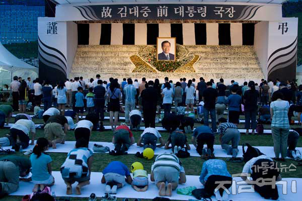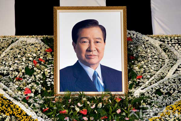 ▲김 전 대통령은 우리에게 무엇을 말하고 있을까? 김 전 대통령의 얼굴을 제외하고 근조 리본이 가득 찼다.