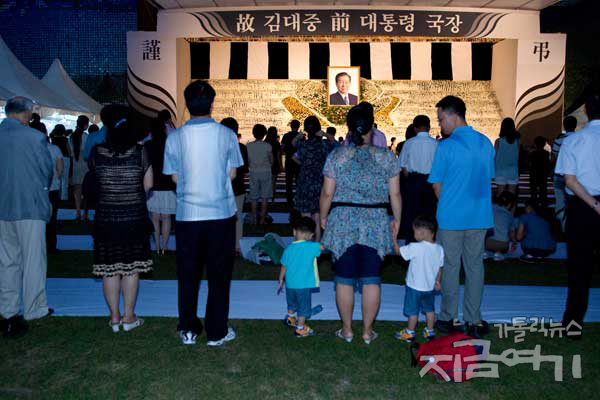 ▲가족이 모두 손을 잡고 나와 김대중 전 대통령 분향소에서 조문하고 있다.