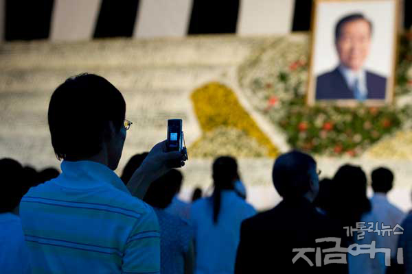 ▲한 시민이 김 전 대통령과의 이별이 아쉬운 듯 휴대전화기에 고인의 모습을 담고 있다.